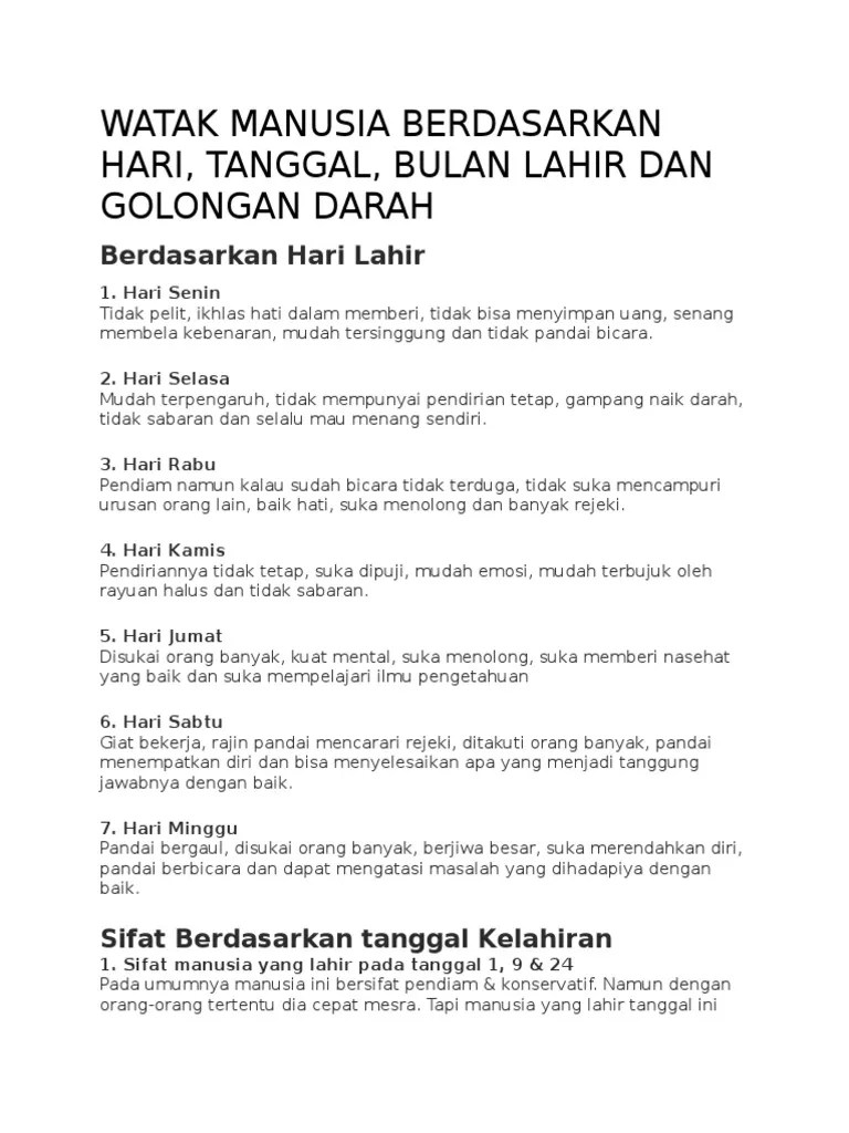 Hari kelahiran seseorang ternyata disebut bisa mempengaruhi watak dan sifat seseorang. Jadi kalau dia nolong orang nggak pernah nanggung. Watak yang dimiliki hari minggu memiliki kewibawaan dan sifat yang menonjol, hingga rasa kasih yang besar. Tetapi walau demikian mereka memiliki sifat belas kasih terhadap . Berdasarkan beberapa pengamatan yang dilakukan oleh para ahli di bidangnya, seseorang yang terlahir di hari sabtu biasanya mempunyai karakter . Seseorang yang lahir di hari . Watak anak kelahiran weton sabtu menurut primbon jawa, karakter dan sifat dalam . Keistimewaan mereka yang lahir hari sabtu adalah pecinta kesederhanaan. Jika kamu terhahir di hari tersebut, maka elemen yang . Selain rajin, ini karakter lain seseorang yang lahir di hari sabtu · 1. Kesuksesan orang yang lahir hari sabtu | rejeki yang kamu akan dapatkankarakter,karakter hari lahir,hari lahir,prediksi,sabtu,karakter . Orang yang lahir hari sabtu sifatnya keras kepala, tidak mau mengalah dan merasa benar sendiri, tapi dari segi sifat baiknya .